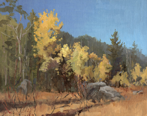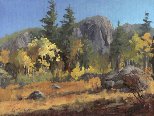 November 26 , 2025 What a beautiful day of painting, catching the aspens at their peak. Disks of yellow and gold danced in the sunlight below sharp-edged cliffs as the river turned just beyond the trees. If I were to choose a piece of music to express the day it would be Aaron Copland's 'Fanfare for the Common Man,' full of its own golden light and expansiveness. 9" x 12" oil on linen panel $760 Art in the Morning Special