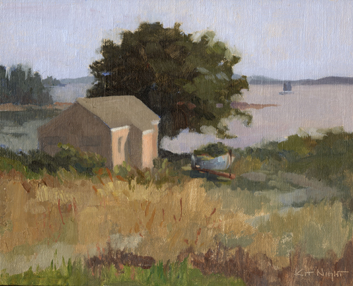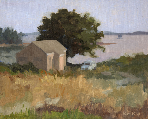 October 1 , 2025 When I'm not painting in the Sierra, plein air can be kind of high impact. Balanced on a spit of dirt alongside a highway, planted next to a sign post in an intersection, perched on a bluff above lobster trucks barreling along to the sound of boat horns, a place of quiet green becomes a fantasy. I could have called this painting 'The Kindness of Strangers.' Inviting us to paint on her land and spend a peaceful day looking at light upon the water, ships cruising the horizon, and listening to gulls out beyond and crickets in the grass, was a gift greater than one could hope for. 9" x 12" oil on panel sold