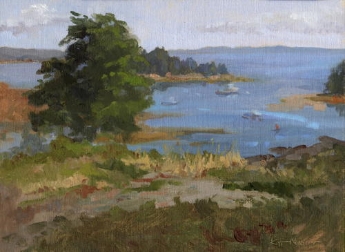October 1 , 2025 When I'm not painting in the Sierra, plein air can be kind of high impact. Balanced on a spit of dirt alongside a highway, planted next to a sign post in an intersection, perched on a bluff above lobster trucks barreling along to the sound of boat horns, a place of quiet green becomes a fantasy. I could have called this painting 'The Kindness of Strangers.' Inviting us to paint on her land and spend a peaceful day looking at light upon the water, ships cruising the horizon, and listening to gulls out beyond and crickets in the grass, was a gift greater than one could hope for. 9" x 12" oil on panel $680 sold Art in the Morning Special