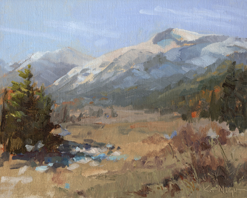 October 22 , 2025 I've never seen the Sierra look like this. The air sparkled with ice crystals creating an atmosphere of silvery light. The mountains, covered in fresh snow, had a soft-focus glow like something the Romantics would wax on about. As I set up in the shade of a pine, it became clear I'd chosen to paint in a bit of a wind tunnel. Donning all the clothes in my pack, I focused on trying to capture the light and freshness of the day. By mid-afternoon the grasshoppers were jumping in the sunlight on the meadow grass. I felt like joining them. 8" x 10" oil on linen panel $630 Art in the Morning Special