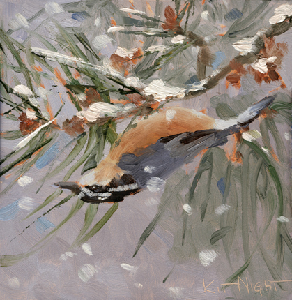 December 31 , 2025 Trumpeting in the new year, the red-breasted nuthatch is also a bit of an acrobat. Wait. Is that Miles, I hear? 6" x 6" oil on panel $360 Art in the Morning Special